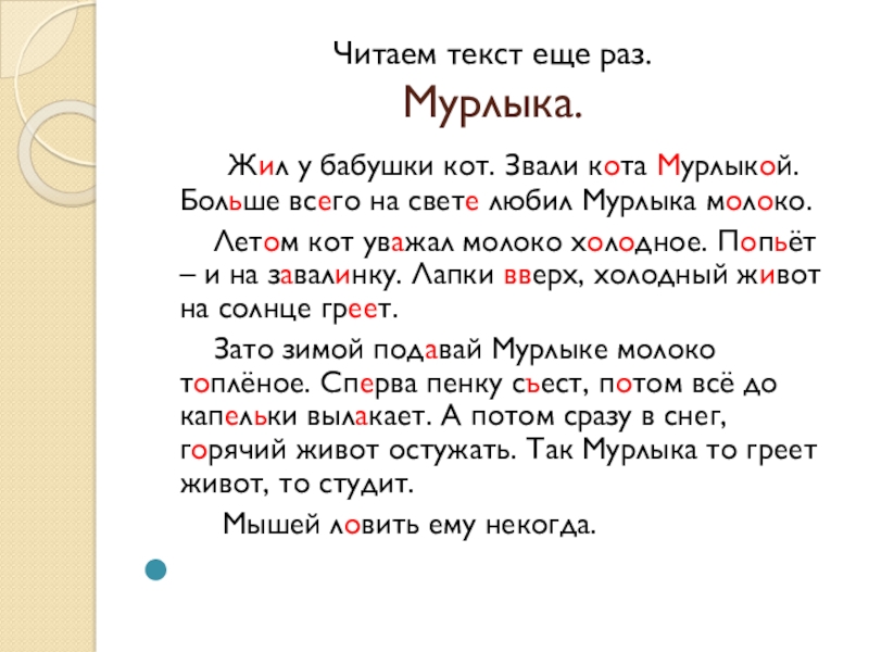 Читаем текст еще раз. Мурлыка.    Жил у бабушки кот. Звали кота Мурлыкой. Больше всего