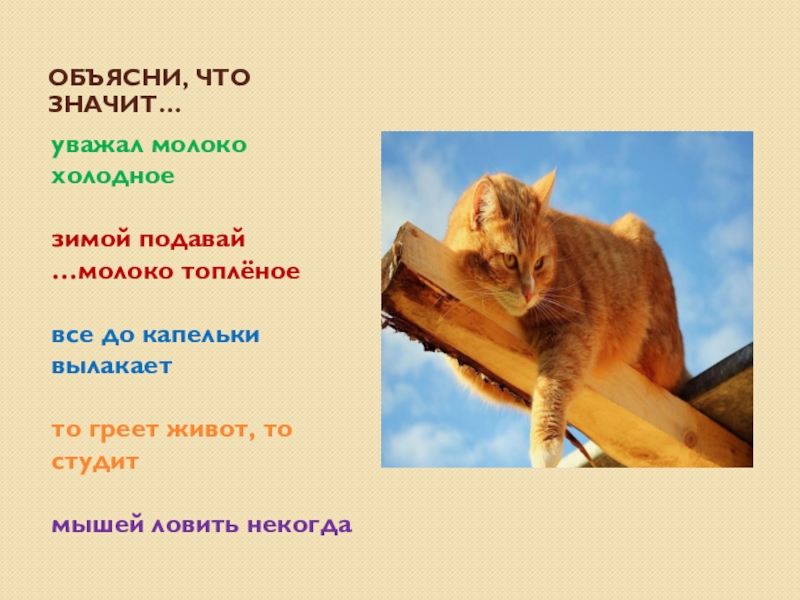 Объясни, что значит…уважал молоко холодноезимой подавай …молоко топлёноевсе до капельки вылакаетто греет живот, то студитмышей ловить некогда