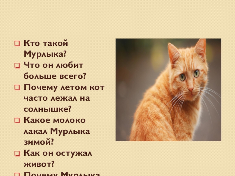 Кто такой Мурлыка?Что он любит больше всего?Почему летом кот часто лежал на солнышке?Какое молоко лакал Мурлыка зимой?Как
