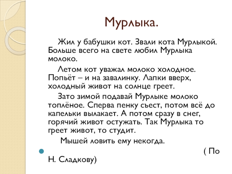 Мурлыка. Жил у бабушки кот. Звали кота Мурлыкой. Больше всего на свете любил Мурлыка молоко. Летом кот уважал молоко холодное. Попьёт – и на завалинку. Лапки вверх, холодный живот на