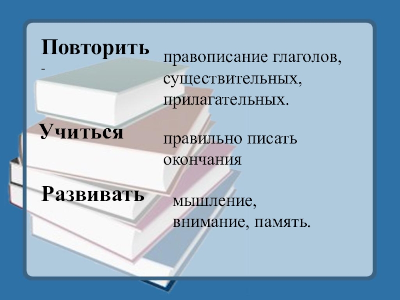 Повторить - УчитьсяРазвиватьправописание глаголов, существительных, прилагательных.правильно писать окончаниямышление, внимание, память.