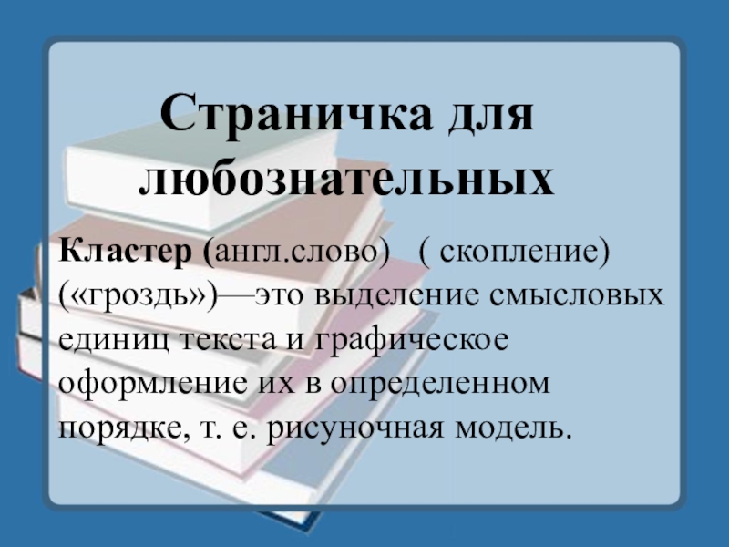 Страничка для любознательныхКластер (англ.слово)  ( скопление) («гроздь»)—это выделение смысловых единиц текста и графическое оформление их в