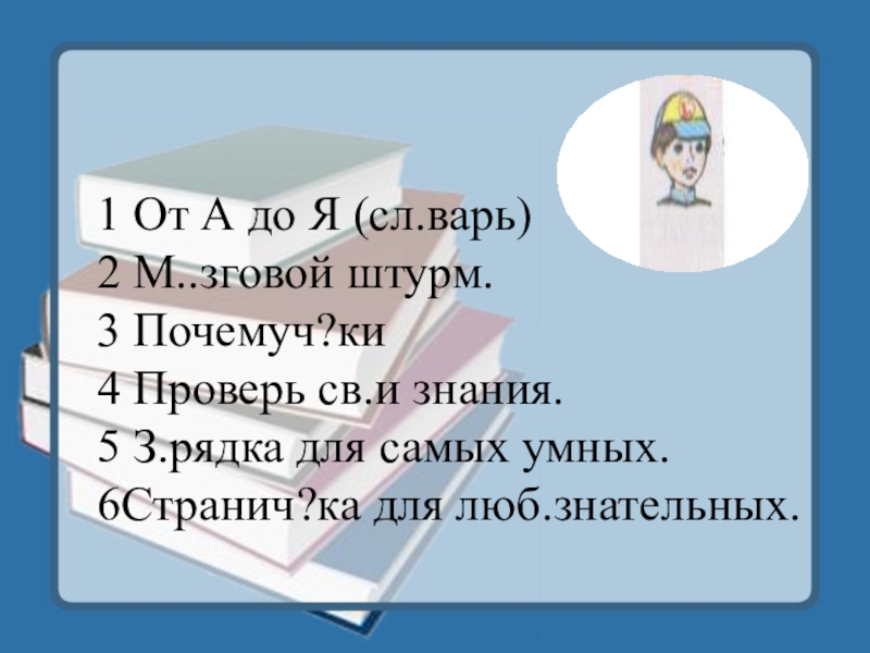 1 От А до Я (сл.варь)2 М..зговой штурм.3 Почемуч?ки4 Проверь св.и знания.5 З.рядка для самых умных.6Странич?ка для