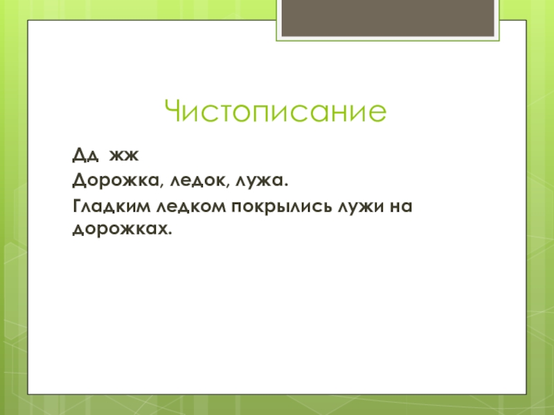ЧистописаниеДд жжДорожка, ледок, лужа.Гладким ледком покрылись лужи на дорожках.