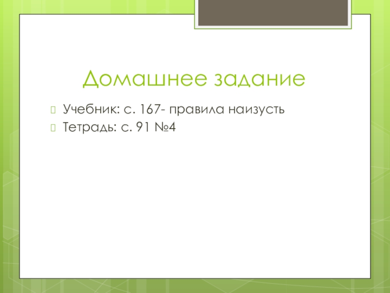 Домашнее заданиеУчебник: с. 167- правила наизустьТетрадь: с. 91 №4