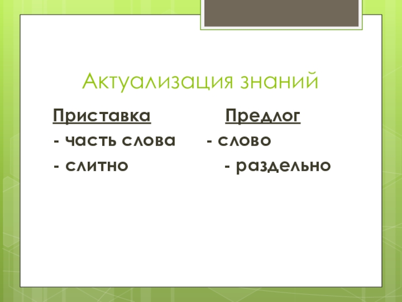 Актуализация знанийПриставка	      Предлог- часть слова	  - слово - слитно