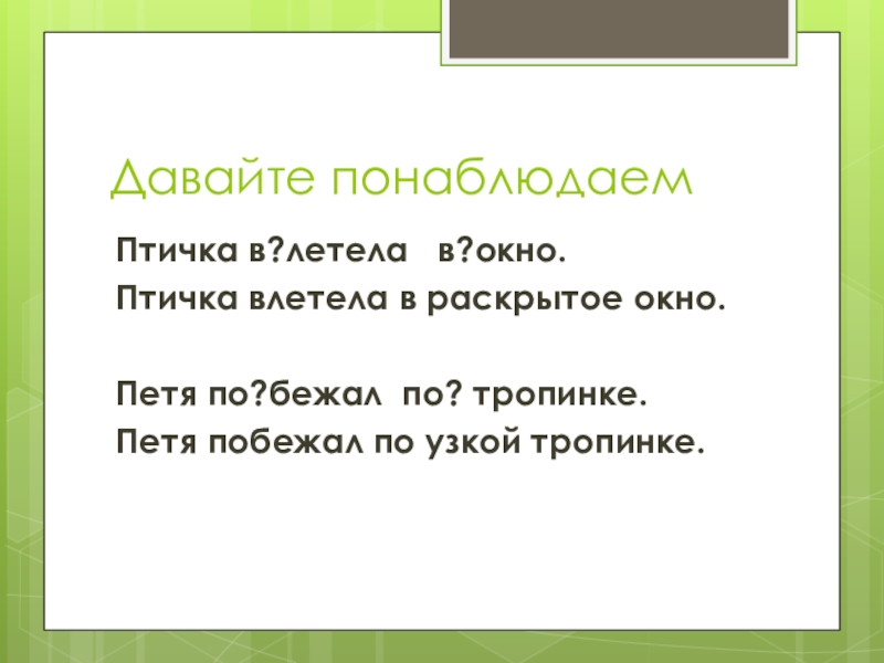 Давайте понаблюдаемПтичка в?летела  в?окно.Птичка влетела в раскрытое окно.Петя по?бежал по? тропинке.Петя побежал по узкой тропинке.