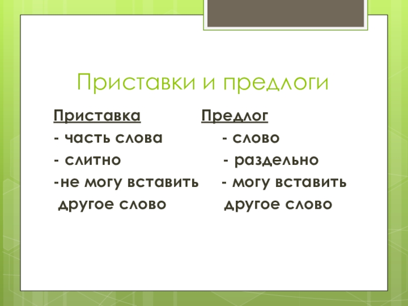 Приставки и предлогиПриставка	      Предлог- часть слова	      -