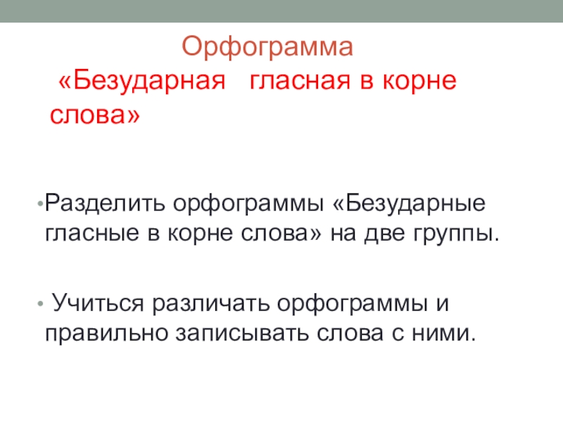 Разделить орфограммы «Безударные гласные в корне слова» на две группы.