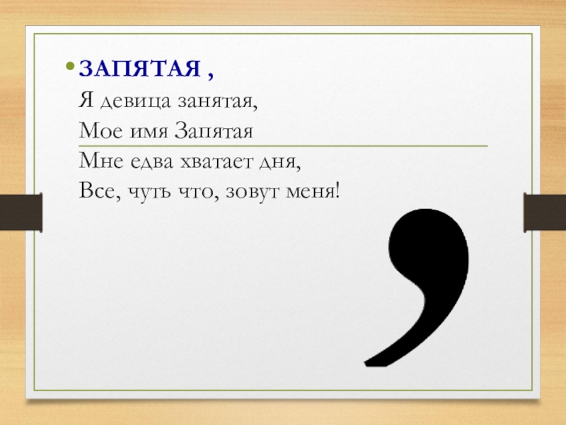 ЗАПЯТАЯ , Я девица занятая, Мое имя Запятая Мне едва хватает дня, Все, чуть что, зовут меня!