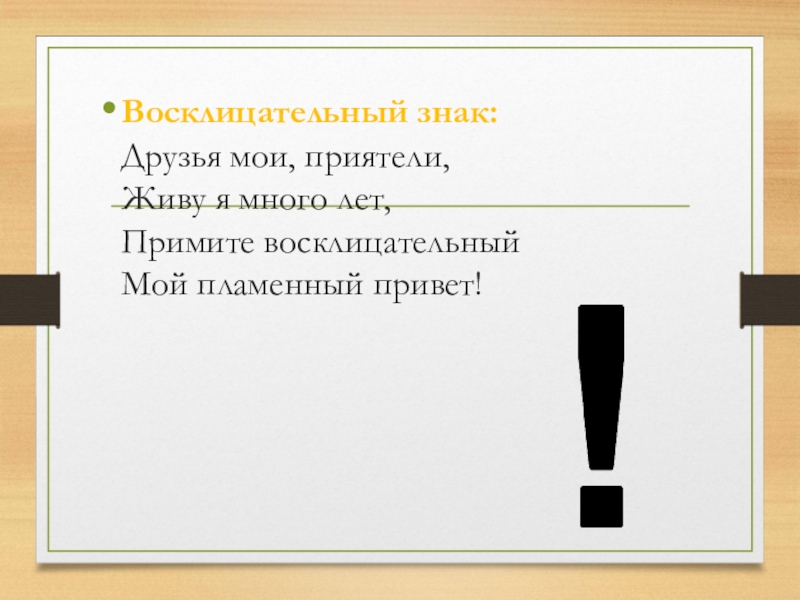 Восклицательный знак: Друзья мои, приятели, Живу я много лет, Примите восклицательный Мой пламенный привет!