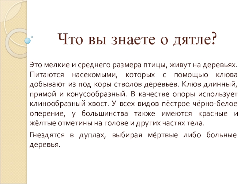 Слайд 3Что вы знаете о дятле?