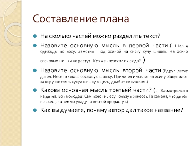 Составление планаНа сколько частей можно разделить текст?Назовите основную мысль в первой части.( Шёл я однажды по лесу.
