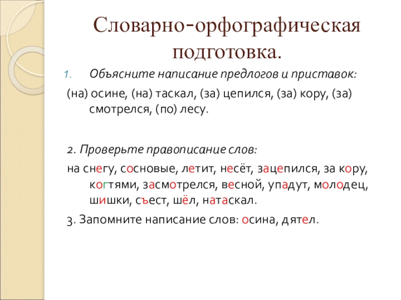 Словарно-орфографическая подготовка.Объясните написание предлогов и приставок: (на) осине, (на) таскал, (за) цепился, (за) кору, (за) смотрелся, (по)