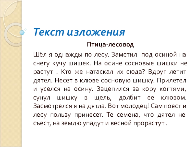 Текст изложенияПтица-лесоводШёл я однажды по лесу. Заметил под осиной на снегу кучу шишек. На осине сосновые шишки