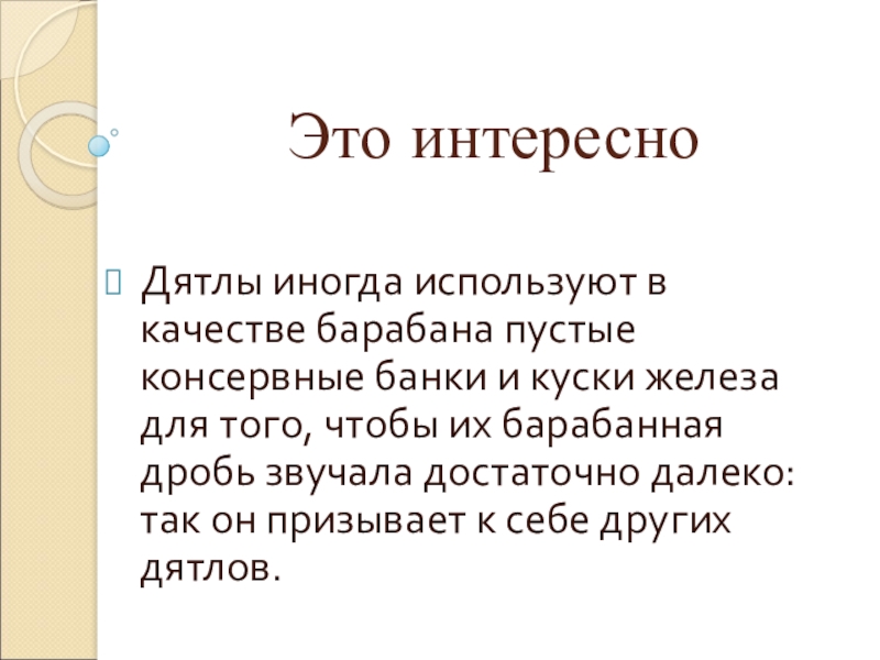 Это интересно Дятлы иногда используют в качестве барабана пустые консервные банки и куски железа для того, чтобы
