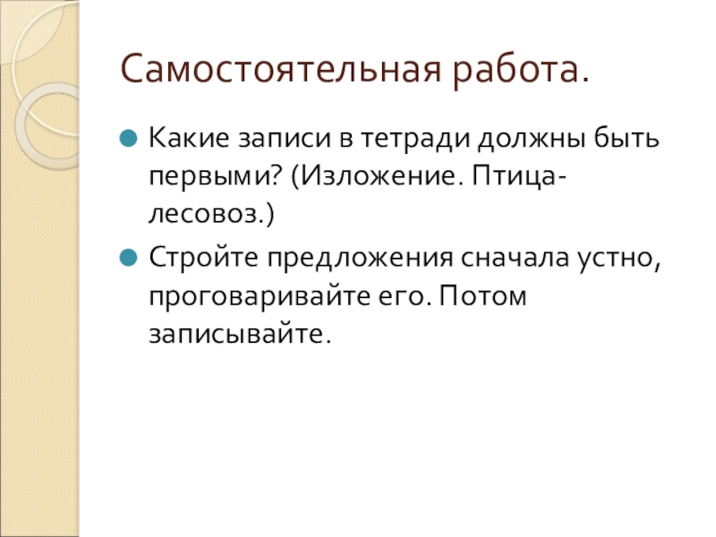 Самостоятельная работа.Какие записи в тетради должны быть первыми? (Изложение. Птица-лесовоз.)Стройте предложения сначала устно, проговаривайте его. Потом записывайте.