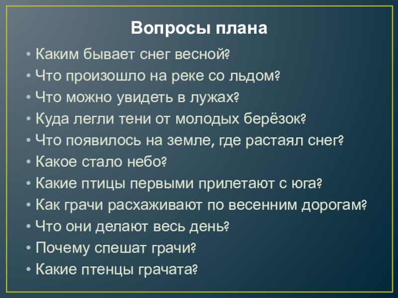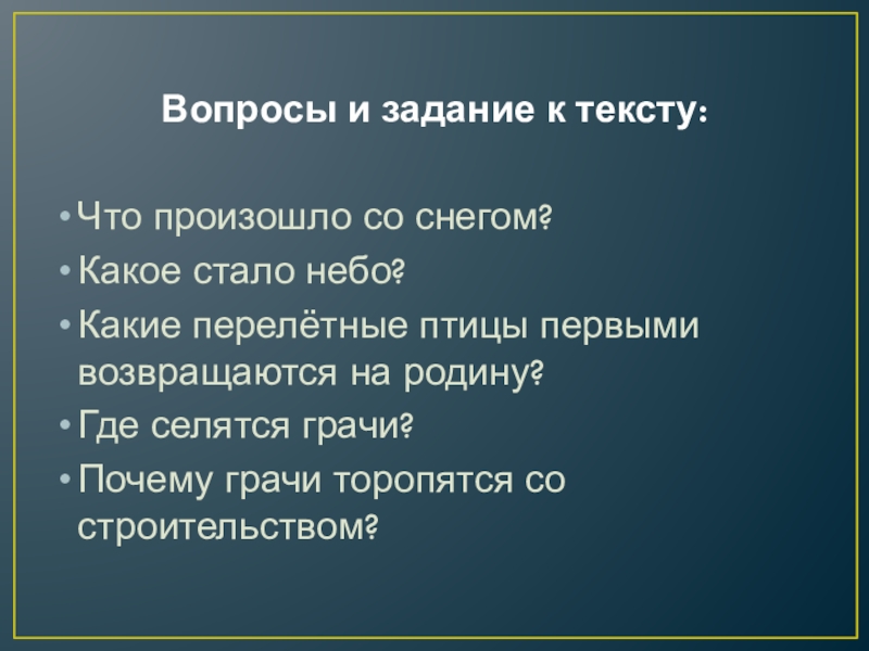 Вопросы и задание к тексту:Что произошло со снегом?Какое стало небо?Какие перелётные птицы первыми возвращаются на родину?Где селятся