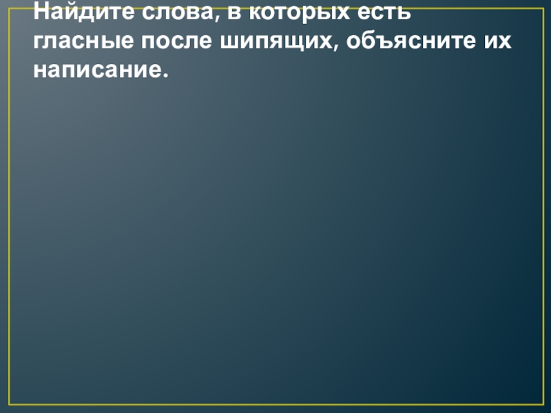 Слайд 14Найдите слова, в которых есть гласные после шипящих, объясните их написание.