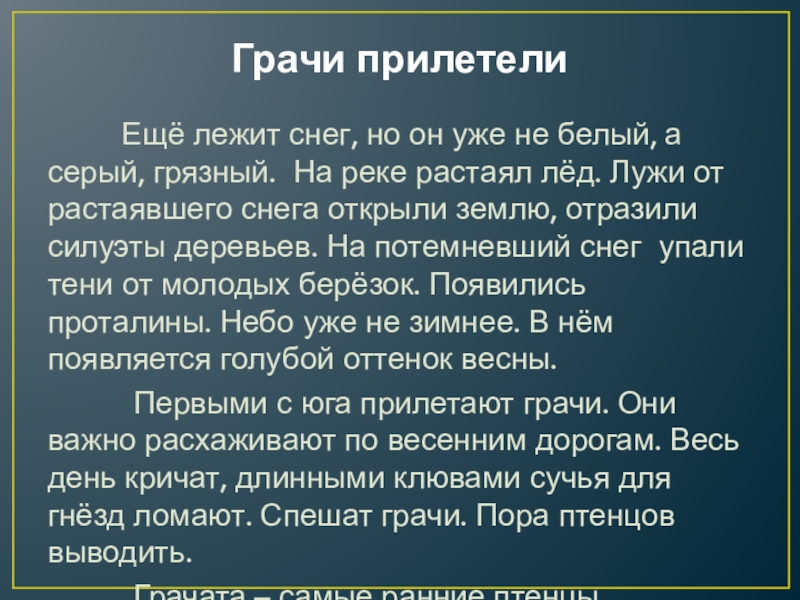 Грачи прилетели Ещё лежит снег, но он уже не белый, а серый, грязный. На реке растаял лёд. Лужи от растаявшего снега открыли землю, отразили силуэты деревьев. На потемневший снег упали тени от