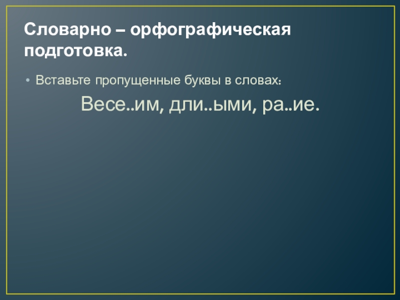 Словарно – орфографическая подготовка.Вставьте пропущенные буквы в словах:Весе..им, дли..ыми, ра..ие.