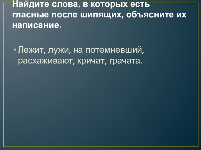 Слайд 12Найдите слова, в которых есть гласные после шипящих, объясните их написание.