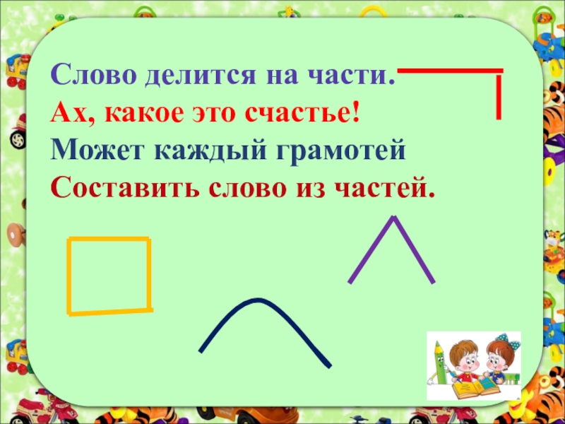 Слово делится на части. Ах, какое это счастье! Может каждый грамотей Составить слово из частей.