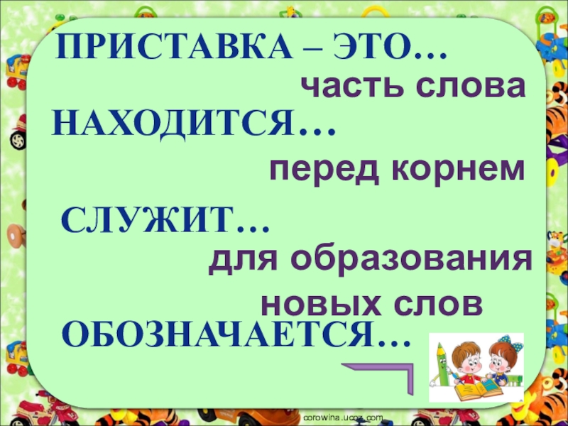 corowina.ucoz.comПриставка – это… Находится…Служит…Обозначается…часть словаперед корнемдля образования новых слов