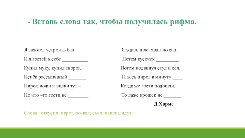Слова : откусил, пирог, позвал, съел, нашли, идут.