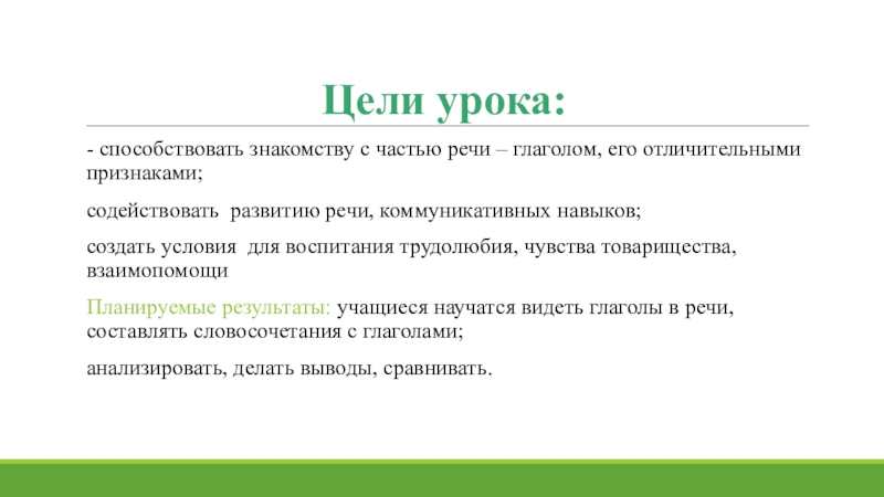 Планируемые результаты: учащиеся научатся видеть глаголы в речи, составлять словосочетания с глаголами;