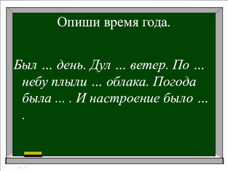 Опиши время года.Был … день. Дул … ветер. По … небу плыли … облака. Погода была ...