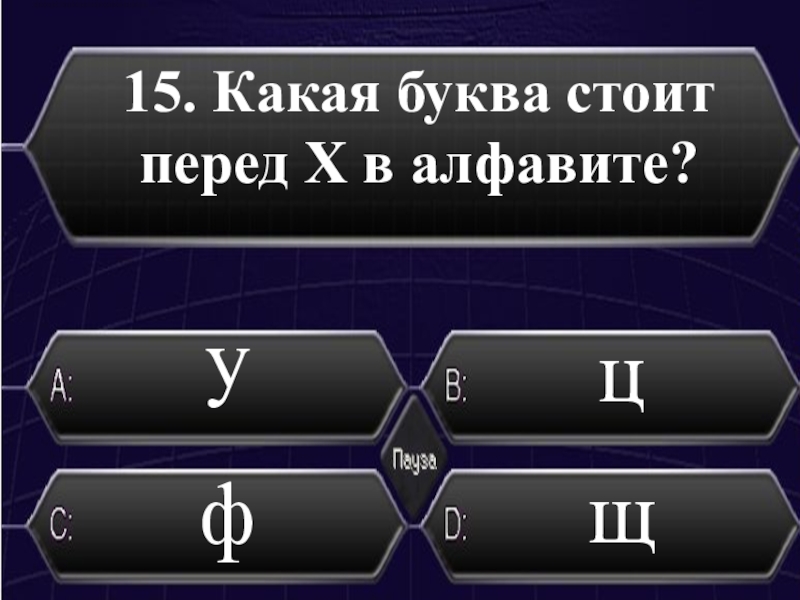 15. Какая буква стоит перед Х в алфавите?фщцу