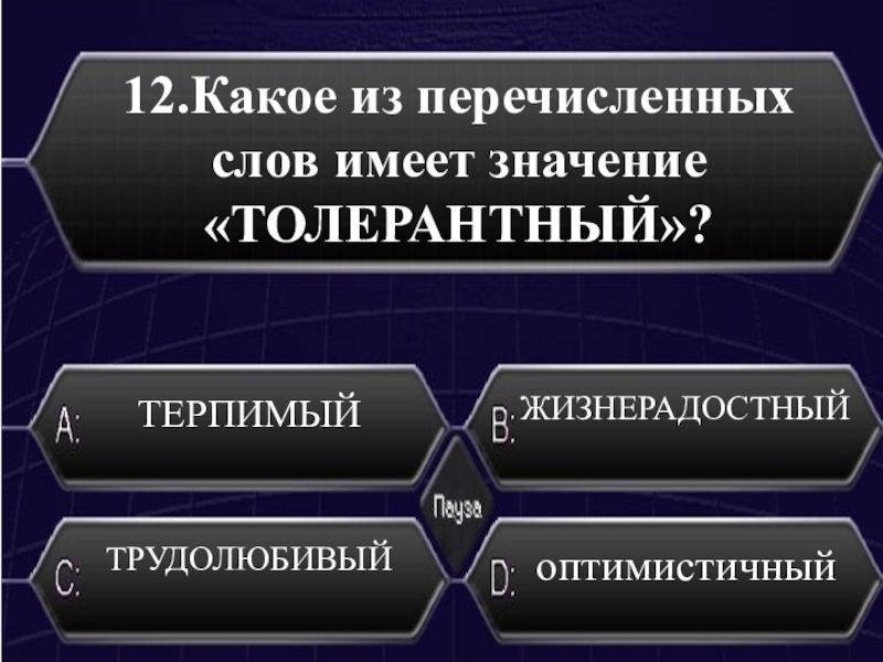 12.Какое из перечисленных слов имеет значение «ТОЛЕРАНТНЫЙ»?ТЕРПИМЫЙЖИЗНЕРАДОСТНЫЙТРУДОЛЮБИВЫЙоптимистичный