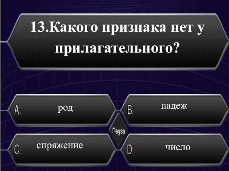 13.Какого признака нет у прилагательного?спряжение	числопадеж	род