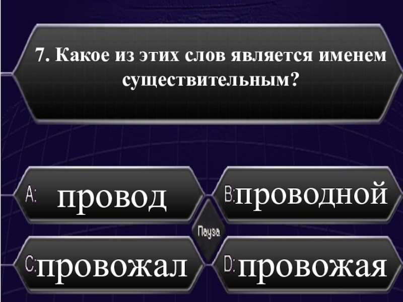 7. Какое из этих слов является именем существительным?проводпроводнойпровожалпровожая