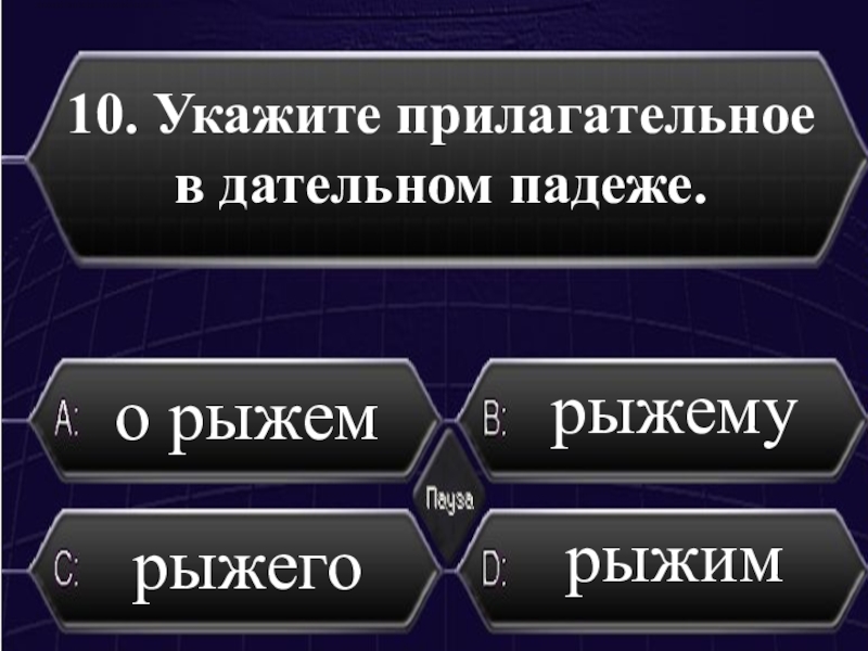 10. Укажите прилагательное в дательном падеже.рыжемуо рыжемрыжегорыжим
