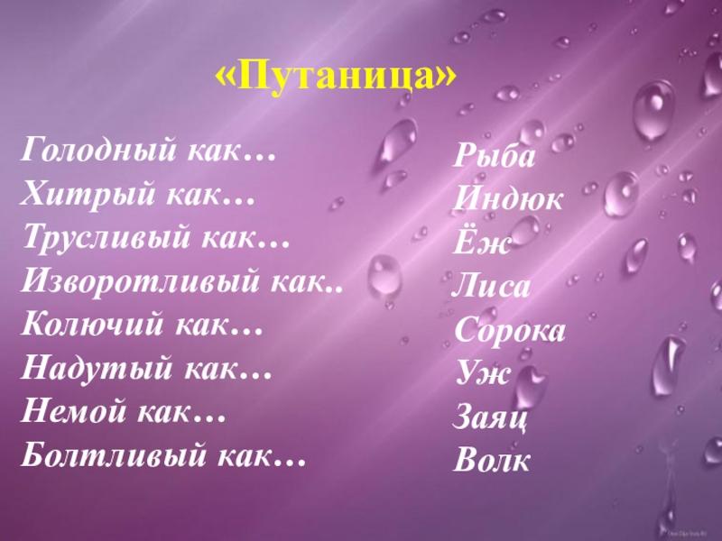 «Путаница»РыбаИндюкЁжЛисаСорокаУжЗаяцВолкГолодный как…Хитрый как…Трусливый как…Изворотливый как..Колючий как…Надутый как…Немой как…Болтливый как…