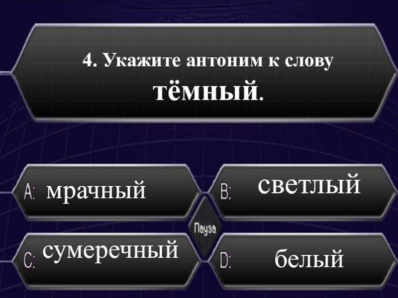 4. Укажите антоним к слову тёмный.светлыйсумеречныйбелыймрачный