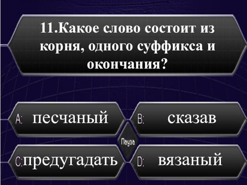 11.Какое слово состоит из корня, одного суффикса и окончания?песчаныйсказавпредугадатьвязаный