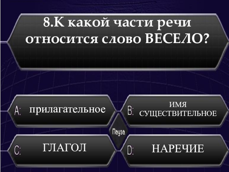 8.К какой части речи относится слово ВЕСЕЛО?НАРЕЧИЕприлагательноеИМЯ СУЩЕСТВИТЕЛЬНОЕГЛАГОЛ
