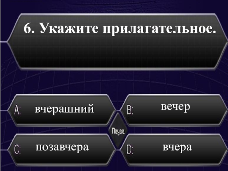 6. Укажите прилагательное.вчерашнийвчерапозавчеравечер