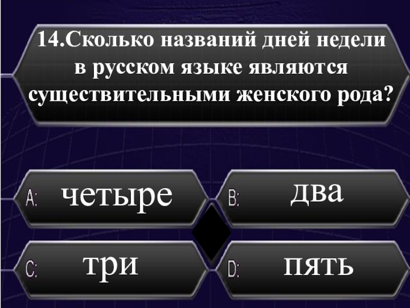 14.Сколько названий дней недели в русском языке являются существительными женского рода?четыредвапятьтри
