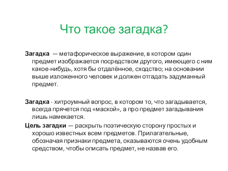 Загадка — метафорическое выражение, в котором один предмет изображается посредством другого, имеющего с ним какое-нибудь, хотя бы отдалённое, сходство; на основании выше изложенного человек и должен отгадать задуманный предмет.
