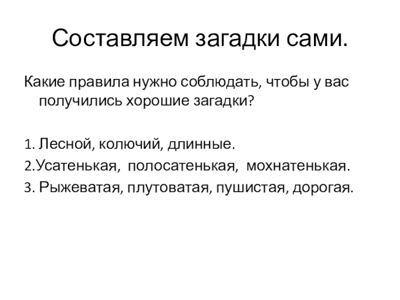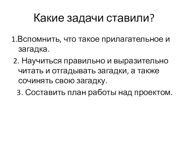 2. Научиться правильно и выразительно читать и отгадывать загадки, а также сочинять свою загадку.