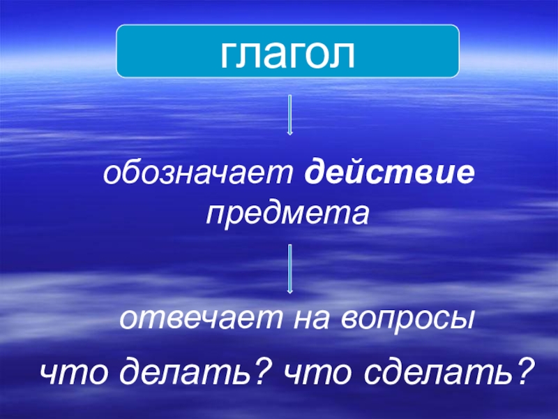 глаголобозначает действие  предметаотвечает на вопросы что делать? что сделать?