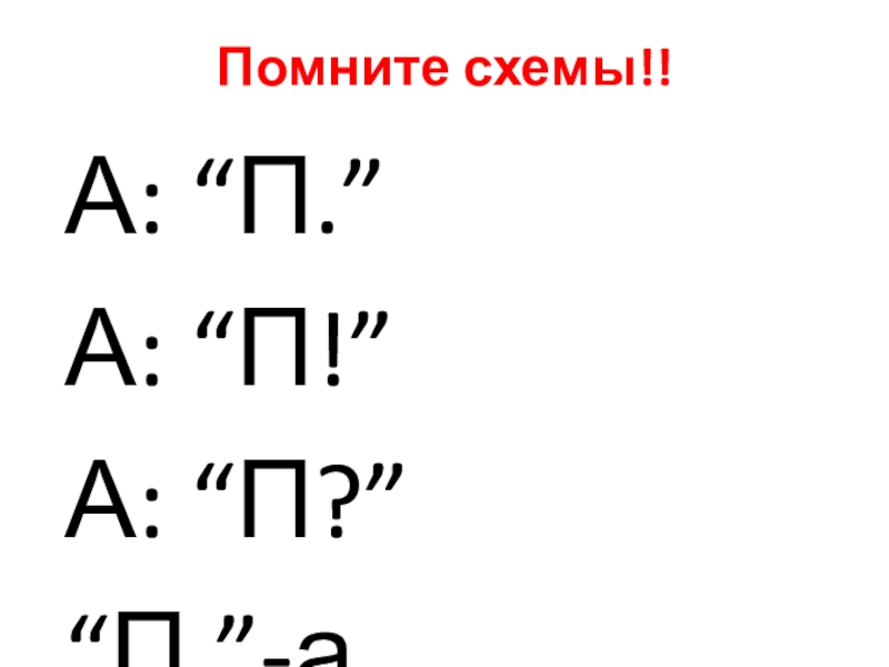 Помните схемы!!А: “П.”А: “П!”А: “П?”“П,”-а.“П!”-а.“П!”-а.