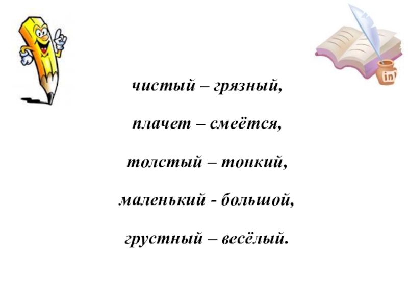 чистый – грязный,плачет – смеётся,толстый – тонкий,маленький - большой,грустный – весёлый.
