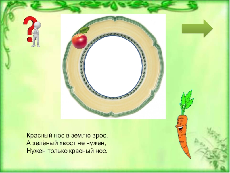 морковьКрасный нос в землю врос,  А зелёный хвост не нужен,  Нужен только красный нос.