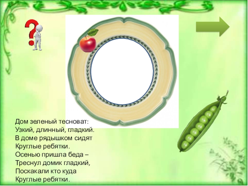 ГОРОХДом зеленый тесноват:  Узкий, длинный, гладкий.  В доме рядышком сидят  Круглые ребятки.  Осенью пришла беда –  Треснул
