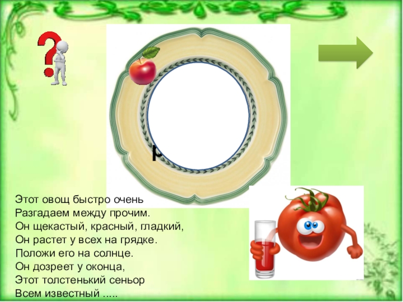 помидорЭтот овощ быстро очень  Разгадаем между прочим. Он щекастый, красный, гладкий, Он растет у всех на грядке.